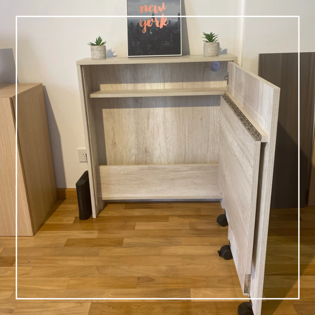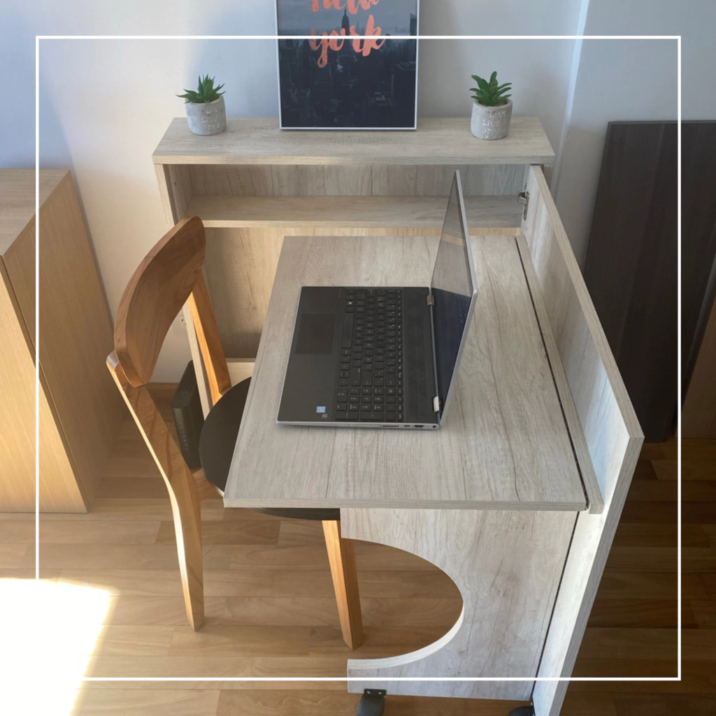 Funciona durante el día como un amplio escritorio para trabajo y al final de la jornada se transforma en un canchero dressoir o mesa de luz que guarda en su interior todos los elementos de trabajo, adaptándose a espacios pequeños . Ya viene armado y en caja no requiere amurar. Practico para poner en cualquier rincón de la casa y mover de acuerdo a la necesidad.Abierto ocupa 80 cm x 92 cm . El area de trabajo es de 72 cm x 52 cm. Ideal para home office o escritorio estudiantes